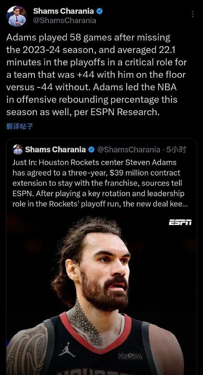 Shams报道,消息人士透露,火箭中锋亚当斯同意以3年3900万美元的合同提前续约火箭。